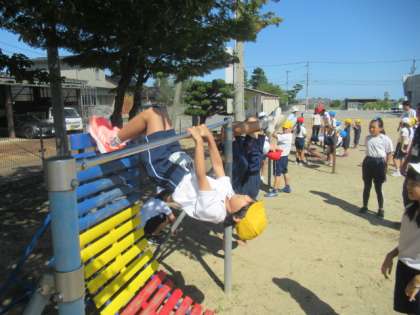 全校 チャレンジタイム(鉄棒) 公開日 2024/09/25 更新日 2024/09/25 3年生 「逆上がり」に挑戦中・・・ 「もう少しで逆上がりができそう」という子が、たくさんいます。 腕(肘)を曲げて、お腹や太ももを鉄棒にくっつけようとする気持ちが大切ですね。 「もう少しでできそう。ガンバレ!」