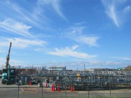 爽やかな秋晴れの下、校舎建設工事が進みます。 画像は、南東から北西方向
