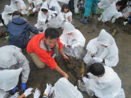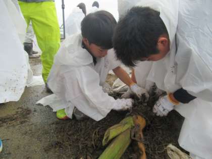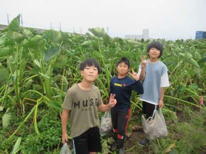未来の農業担い手育成プログラム(5年生) 公開日 2024/10/09 更新日 2024/10/09 5年生 自分の身長よりも背が高い「さといも」畑の前で「ハイ、チーズ!」 C「(貴重な体験)そして(お土産)、ありがとうございました!」