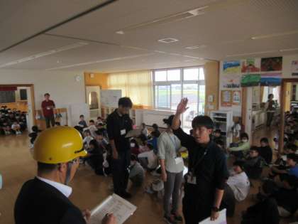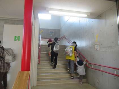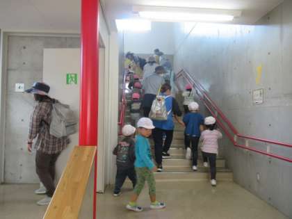 今回は「訓練:地震・津波」により、保育所(そして地域)からも避難してくる、という想定で訓練を実施しました。3F(教室、活動室、廊下等)が避難者で溢れるのではないかと想定して訓練しています。