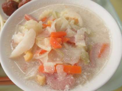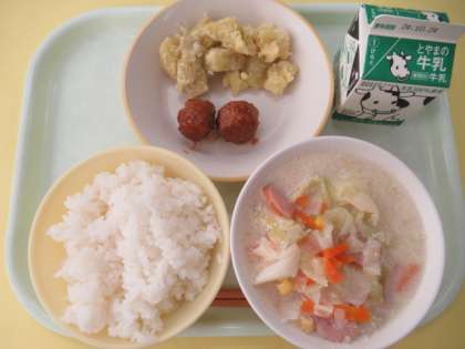 17日(木)今日の献立 公開日 2024/10/17 更新日 2024/10/17 給食室 ・ごはん ・牛乳 ・ミートボール ・チーズおさつ ・豆乳野菜スープ ※11時40分、検食終了。 今日も美味しく出来上がっています。毎週木曜日は「パン食」の日ですが、たまに例外の日があります。今日が、その例外の日です。