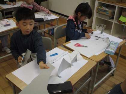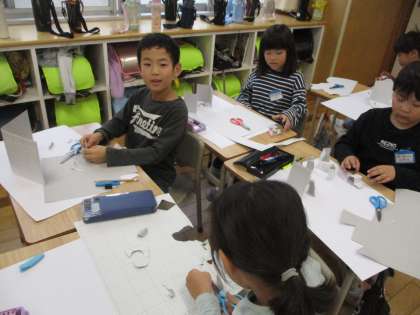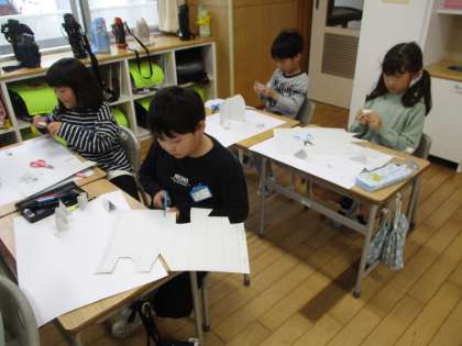 1年生は、図画工作で「折って立てたら」の学習をしています。今日は、画用紙をどんな風に折るとうまく立つか、考えながら活動しました。はさみで好きな形に切って、折り方を工夫しながら楽しんでいました。