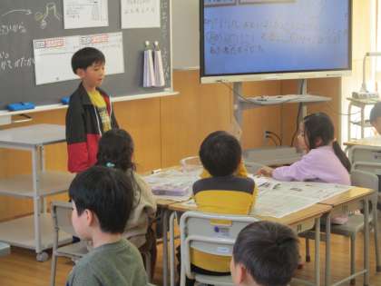 1年生は、算数科で「どちらがおおい」の学習をしています。2つのペットボトルに入る水の量を比べて、どちらが多く入るかをグループで調べました。班の友達と相談して比べ方を考えた後、協力して調べました。