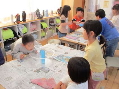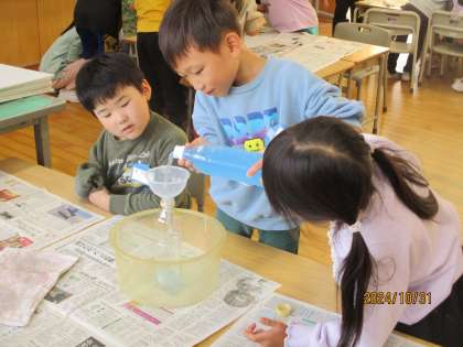 1年生は、算数科で「どちらがおおい」の学習をしています。2つのペットボトルに入る水の量を比べて、どちらが多く入るかをグループで調べました。班の友達と相談して比べ方を考えた後、協力して調べました。