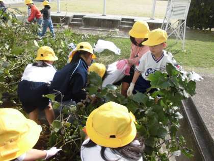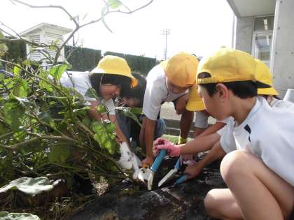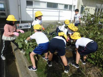 生活科 野菜を育てよう(2年生) 公開日 2024/11/01 更新日 2024/11/01 2年生 最近まで、なすびやオクラの収穫ができました。そんな畑をみんなで片付けました。自分たちの身長より高かった野菜たちをみんなで協力して引っこ抜き、綺麗にしました。