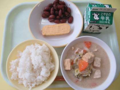 5日(火)今日の献立 公開日 2024/11/05 更新日 2024/11/05 給食室 ・ごはん ・牛乳 ・煮豆 ・厚焼き卵 ・ごま豆乳鍋 ※11時40分、検食終了。 今日も美味しく出来上がっています。1・2年生の「厚焼き卵」は、少し小さめです。 今週から? 急に肌寒くなり、お鍋料理がおいしい季節となりました。 【調べてみよう!三成っ子】 「お鍋料理」には、どんな「〇〇鍋(なべ)」がある? あなたの好きな「〇〇鍋」ベスト3は、なに?