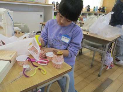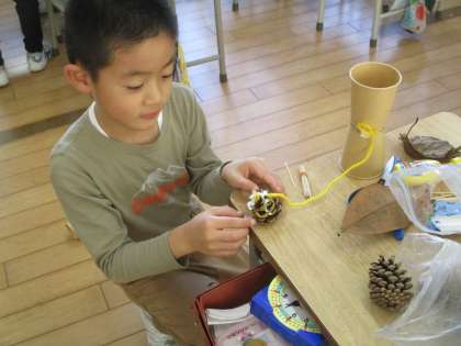 1年生は、生活科の学習で、秋の物を使って、どんな遊びができるか考えながら、遊び道具を作っています。