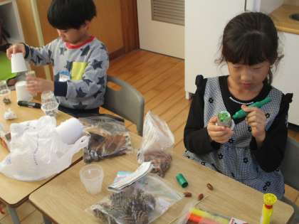 「どんぐり」で「こま」を作ったり、紙コップを貼り合わせて、中に「どんぐり」を入れて「マラカス」を作ったりしました。他にも、どんな遊びをしようかな、と友達と相談しながら活動している子もいました。