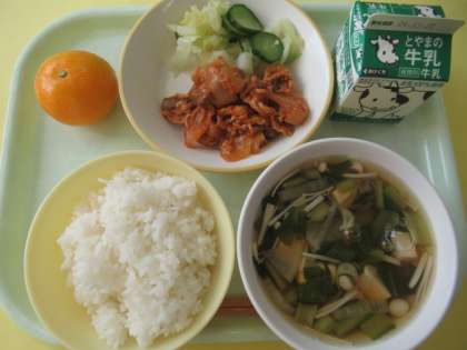 15日(金)今日の献立 公開日 2024/11/15 更新日 2024/11/15 給食室 ・ごはん ・牛乳 ・そえ野菜 ・豚肉とレバーのケチャップソース炒め ・すまし汁 ・みかん ※11時45分、検食終了。 今日も美味しく出来上がっています。デザートに「みかん」がついています。少しずつ「秋〜冬」が感じられるメニューとなってきました。