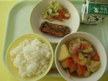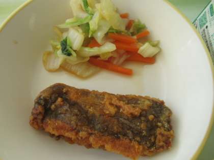 25日(月)今日の献立 公開日 2024/11/25 更新日 2024/11/25 給食室 ・ごはん ・牛乳 ・魚の竜田揚げ ・甘酢和え ・ベーコンとじゃがいもの煮物 ※11時45分、検食終了。 今日も美味しく出来上がっています。「魚の竜田揚げ」に使われている魚は「ホキ」です。1・2年生は、少し小さめになっています。