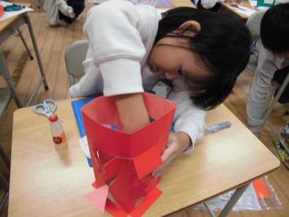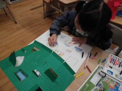 カッターを使って工作をしています。建物や町を工夫して作っています。カッターで切った窓に合わせて絵を描いています。