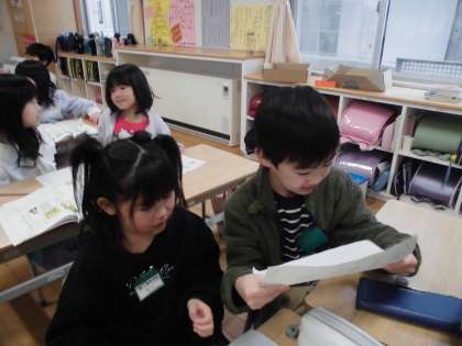 国語科「お話のさくしゃになろう」(2年生) 公開日 2024/12/17 更新日 2024/12/17 2年生 挿絵から物語を考えました。「はじめ」「中」「終わり」の構成をもとに、友達に物語の内容を伝えました。自分で考えた物語を楽しそうに紹介する子供たちでした。