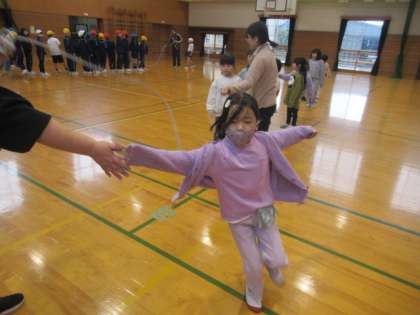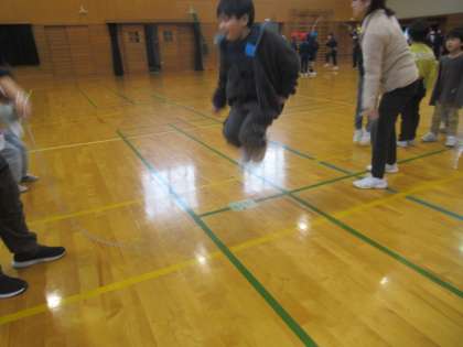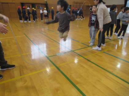 チャレンジタイム(1年生) 公開日 2024/12/18 更新日 2024/12/18 1年生 体育館で「大縄8の字跳び」の練習・・・ 縄を跳んだ後、先生と「タッチ」します。そうすることで、縄に引っかからずに最短で抜け出すコースを身に付けます。