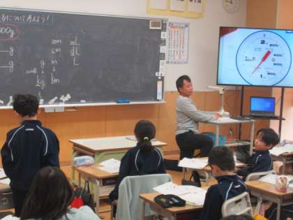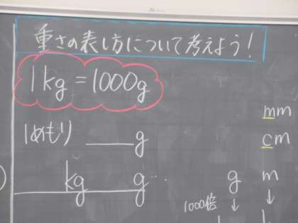 算数科(3年生) 公開日 2024/12/18 更新日 2024/12/18 3年生 目盛りの読みとり方や単位の変換(1kg=1000g)など・・・ 「kg」「km」の「k(キロ)=1000(千)」ですね。 逆に「mg」「mm」の「m(ミリ)=1/1000(千分の1)」ですね。 がんばっています!