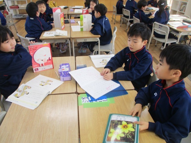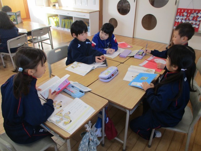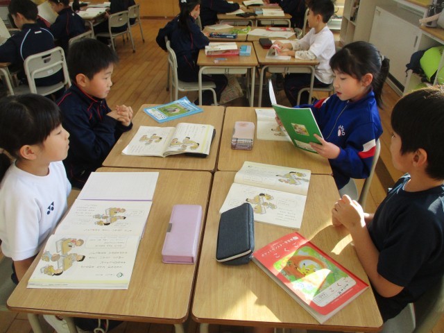 1年生は、国語科「くわしくきこう」の学習で、自分の好きなお話とその話のおもしろいところをグループの友達に伝えました。次に、聞いた人が、もっと知りたことを友達に質問しました。みんなしっかり友達の話を聞いて、質問することができました。