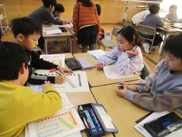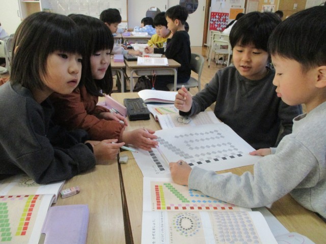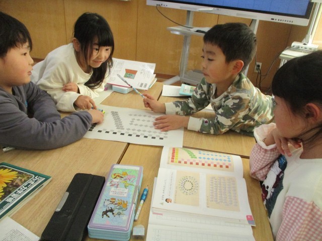 1年生は、算数科「おおきいかず」の学習で、教科書の問題に、グループのみんなで挑戦しました。10ずつまとまりをつくって、正しく数えていました。