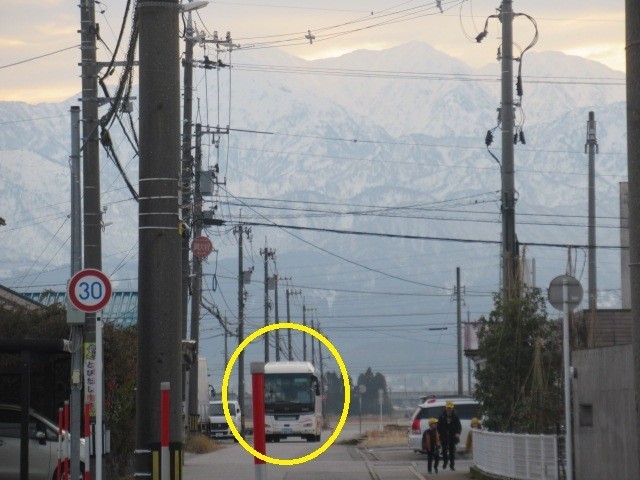雪山を背に、スクールバスも到着します・・・