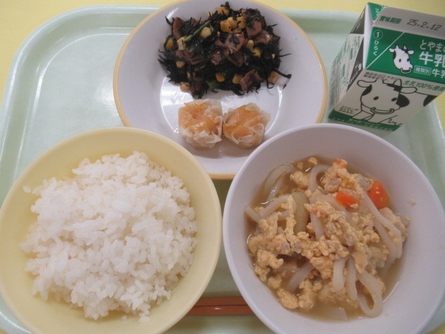 5日(水)今日の献立 公開日 2025/02/05 更新日 2025/02/05 給食室 ・ごはん ・牛乳 ・にんじんシューマイ・ひじきとコーンのソテー ・卵とじ※11時55分、検食終了。今日も美味しく出来上がっています。