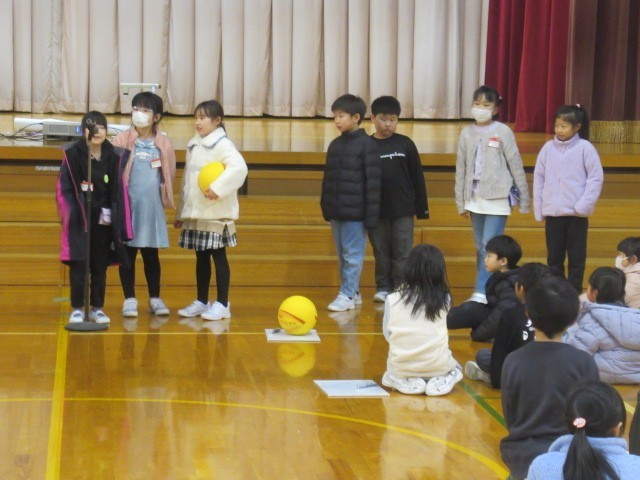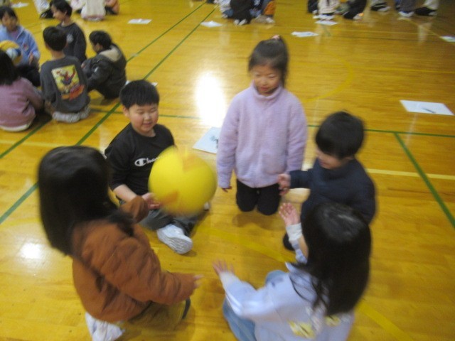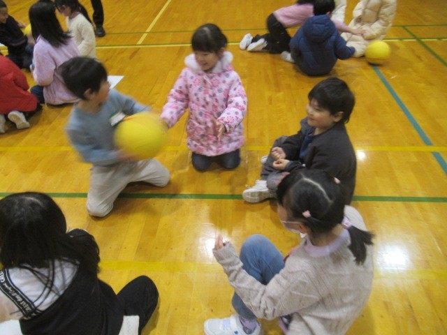 次は「ばくだんゲーム」・・・音楽が止まった時にボール(ばくだん)を持っていた子は、自己紹介(学年と名前、好きな食べ物)します。