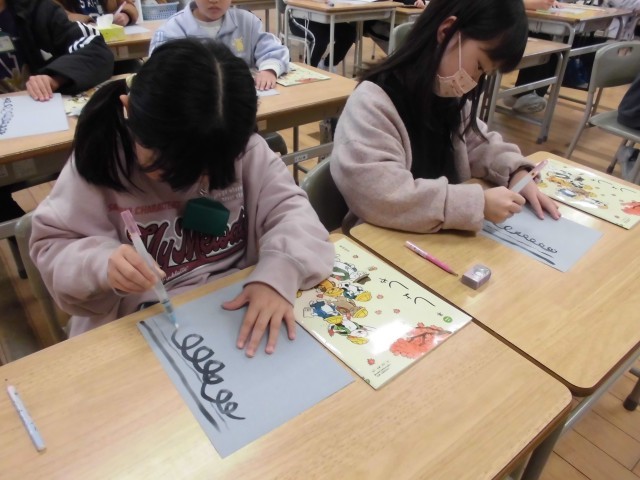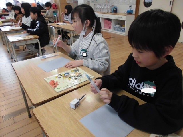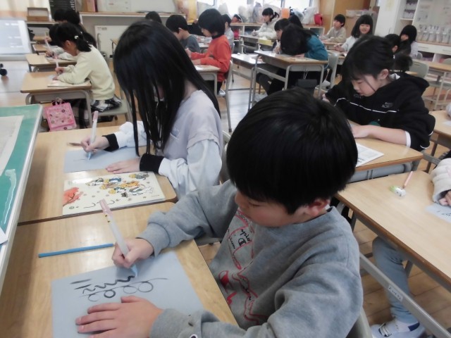 水筆を使って、線や文字を書きました。鉛筆とは違う書き心地を楽しむ子供たちです。
