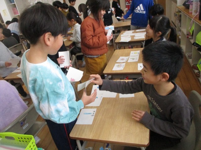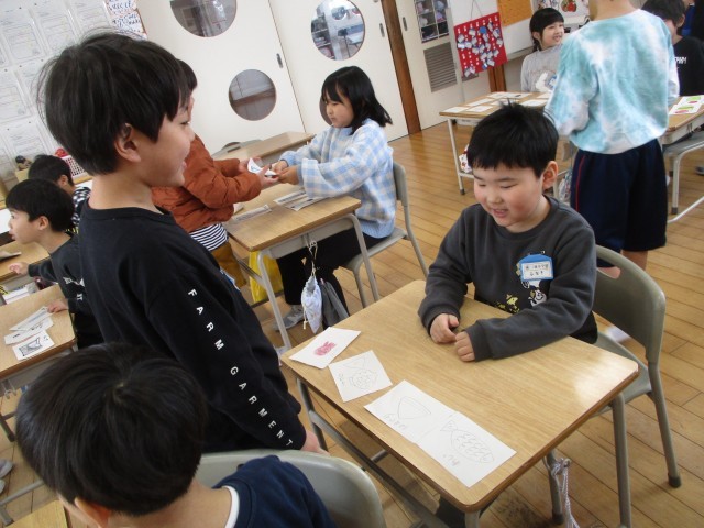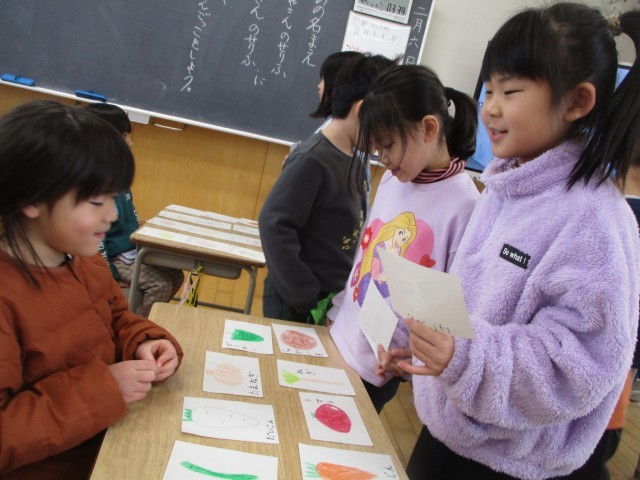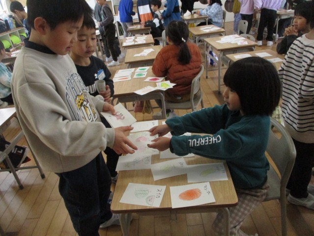1年生は、国語科で「ものの名まえ」を学習しました。その後、自分で物の名前と絵を描いたカードを使って、お店屋さんごっこをしました。お店屋さん役は、大きな声で「いらっしゃいませ」や「ありがとうございました」と言ったり、お客さん役は、「○○をいくつください」と伝えたりしました。