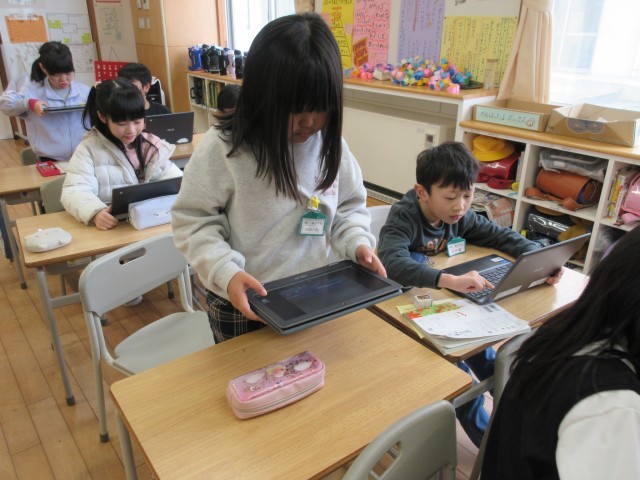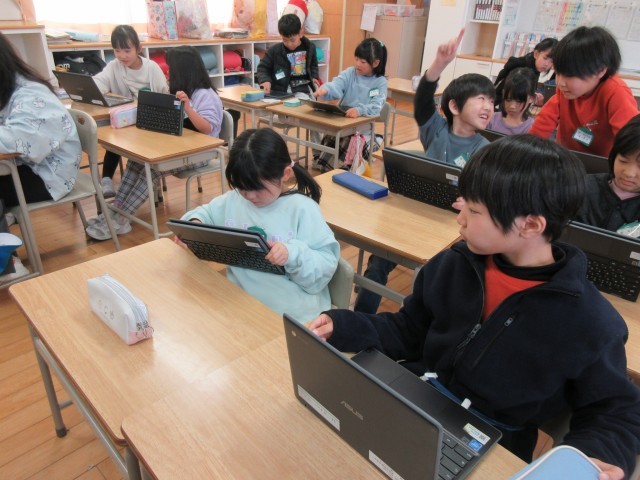 今日はICT指導員の方に来ていただき、3年生に向けてクロームブックの操作の学習を手伝っていただきました。クロームブックのカメラを立ち上げて写真を撮ったり、撮った写真をスライドに載せたりしました。