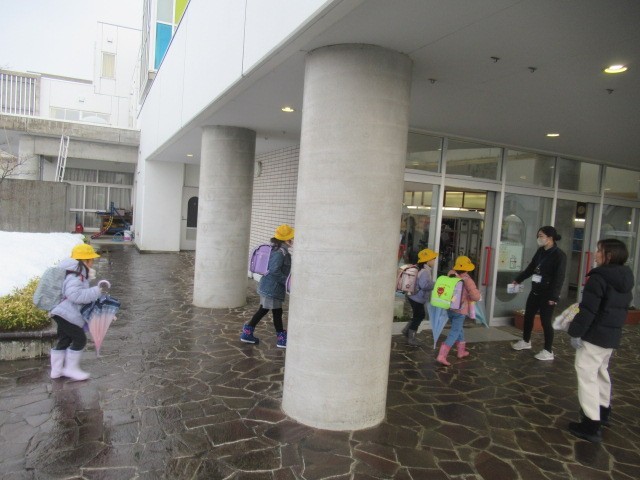 昨日とは打って変わり、雨の朝となりました。積もっている雪や氷は、急速にとけています。
