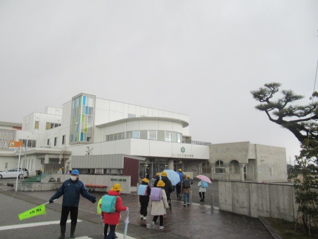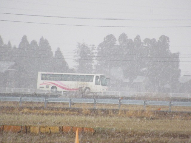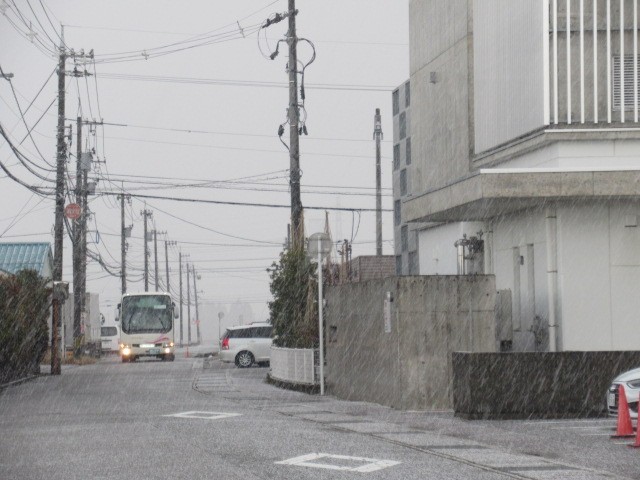 児童玄関前、雨や雪は降っていません。スクールバスが走る辺りは、白っぽくなっています。何か降っているようです。