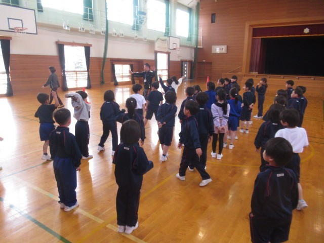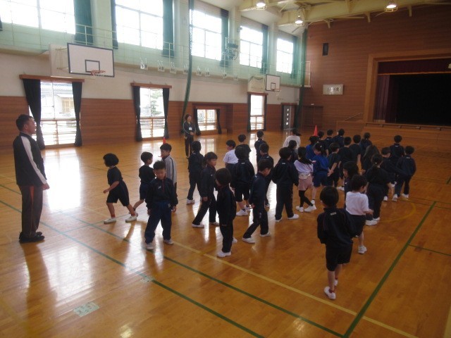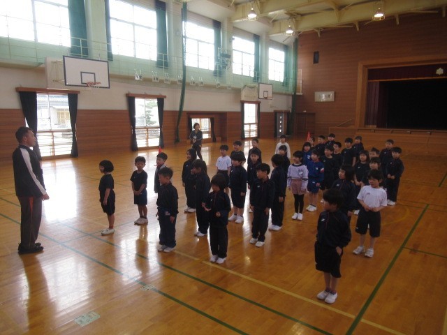 準備体操をしたり、「回れ~右」の練習をしたり・・・これから運動遊びをするようです。