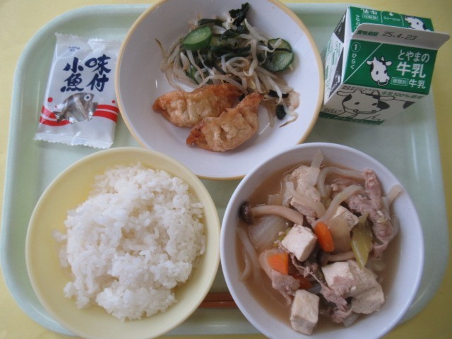 16日(水)今日の献立 公開日 2025/04/16 更新日 2025/04/16 給食室 ・ごはん ・牛乳 ・揚げギョウザ・海藻サラダ ・肉豆腐 ・味付け小魚※11時45分、検食終了。 1~3年生の「揚げギョウザ」は「1個」、4年生以上は「2個」ずつです。