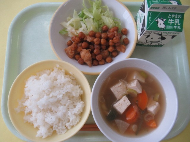 18日(金)今日の献立 公開日 2025/04/18 更新日 2025/04/18 給食室 ・ごはん ・牛乳 ・ゆでキャベツ・鶏肉とひよこ豆の甘からめ ・けんちん汁※11時50分、検食終了。今日も美味しく出来上がっています。 「ひよこ豆」は、ひよこのクチバシのような突起がある豆です。タンパク質や食物繊維、ビタミンなどが豊富とのことです。