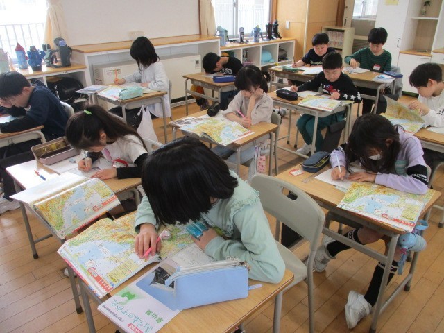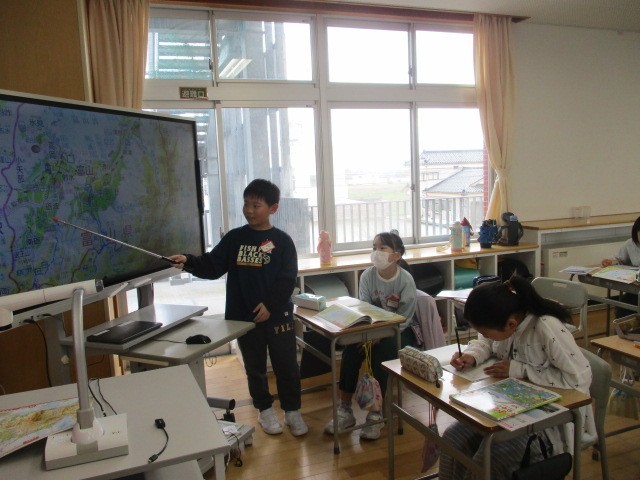 地図帳を見て、富山県の特徴を調べました。気づいたことを発表し、意見を交換しました。