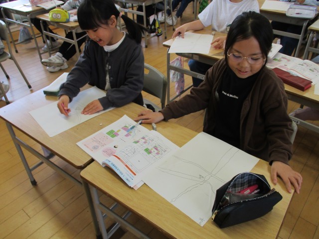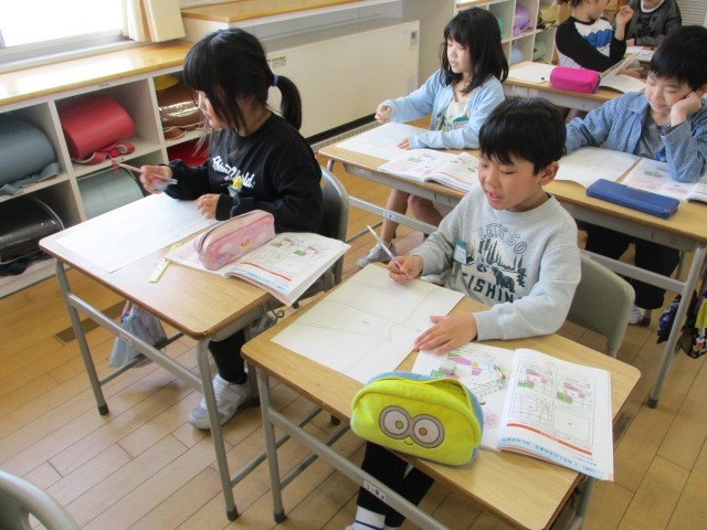 社会(3年生) 公開日 2025/04/22 更新日 2025/04/22 3年生 3年生は、新しく始まった社会科で、方位記号(4方位、8方位)を学習しました。その後、自分たちの学校の校区地図を見ながら、絵地図を描きました。主要道路や川、線路を地図に描き込みました。