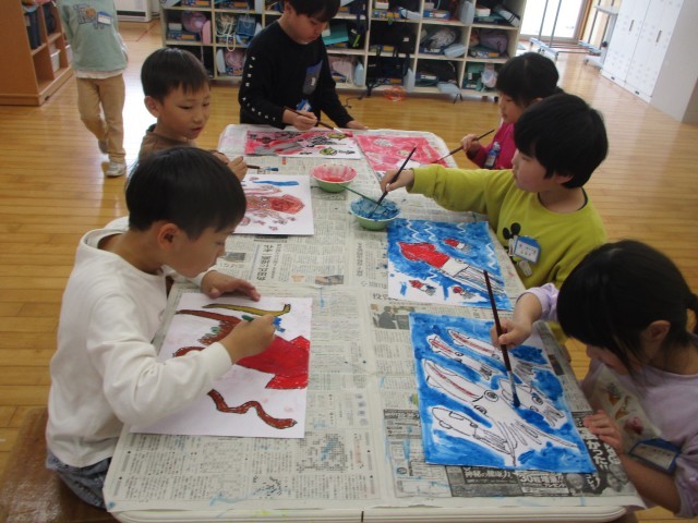 今日はホタルイカの絵に、絵の具で背景を塗りました。