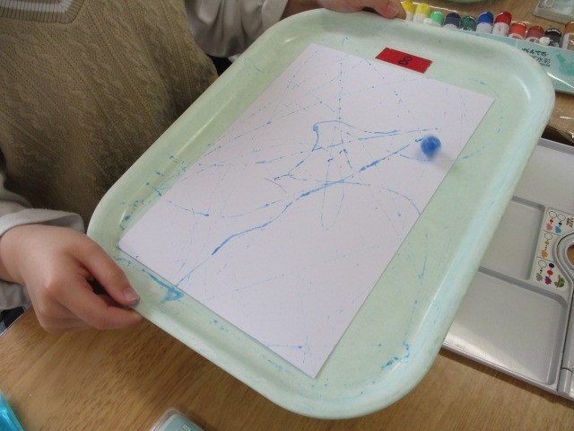 歯ブラシやビー玉に絵の具を付けて、模様を描きました。道具を使って楽しく活動できました。