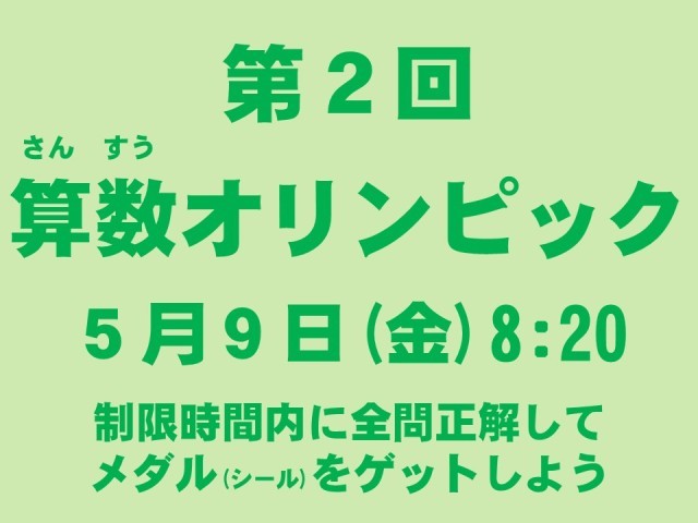 〔お知らせ〕 公開日 2025/05/07 更新日 2025/05/07 お知らせ 毎週金曜日に実施します。 今回は「ひき算②くり下がりあり」(2~6年生)です。 「全問正解」「1秒でも速く」をめざして、がんばりましょう。