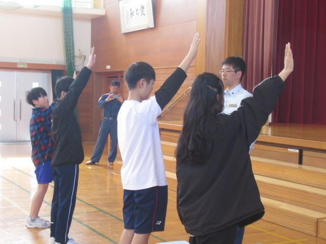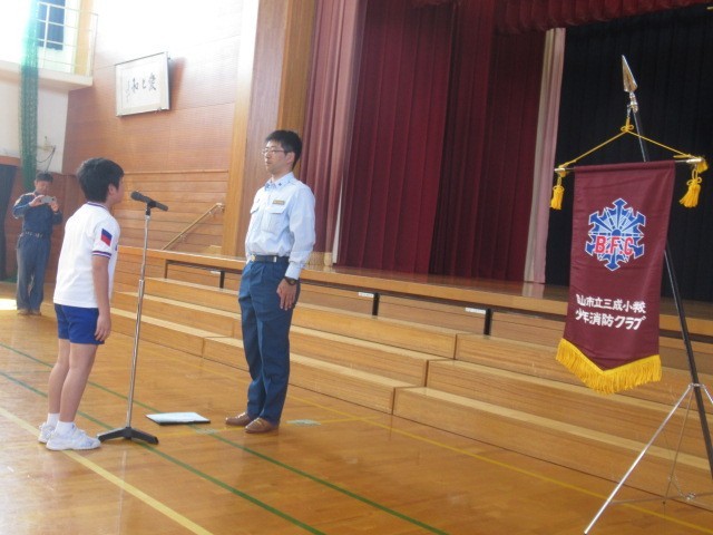 水橋消防署の方から6年生に「BFCバッジ」が授与され、少年防火クラブ員となりました。