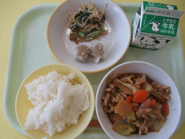 今日のメニューは、「中華料理風」献立です。1・2年生の「肉シューマイ」は、「1個」ずつです。