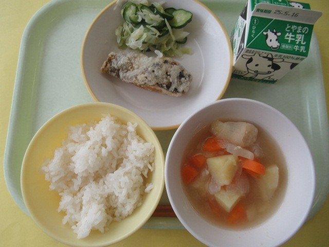 9日(金)今日の献立 公開日 2025/05/09 更新日 2025/05/09 給食室 ・ごはん ・牛乳 ・あじの唐揚げ・きざみ和え ・和風ポトフ※11時50分、検食終了。今日も美味しく出来上がっています。 鰺(あじ)といえば、「あじフライ」が多いと思います。今日の「あじの唐揚げ」は、珍しいですね。