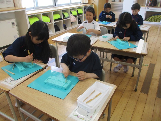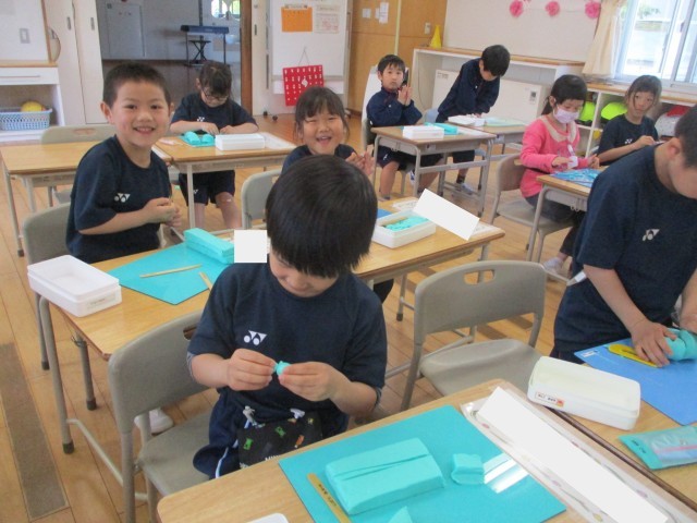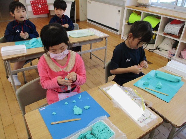 図画工作科では、ねんど遊びをしました。ちぎったりこねたりと、さわり心地を楽しみました。これから色んな形にするのが楽しみです。
