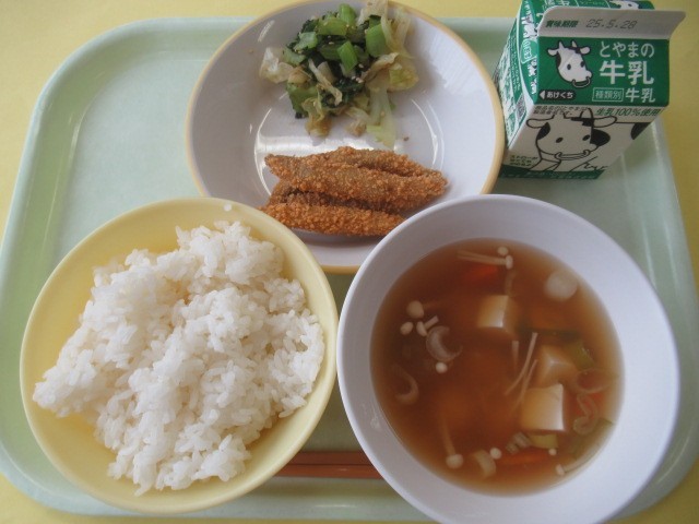21日(水)今日の献立 公開日 2025/05/22 更新日 2025/05/22 給食室 ・ごはん ・牛乳 ・ごまびたし・きびなごのサクサク揚げ ・白玉汁※11時45分、検食終了。 「きびなごのサクサク揚げ」は、1・2年生「3尾」ずつ、3年生以上「4尾」ずつです。