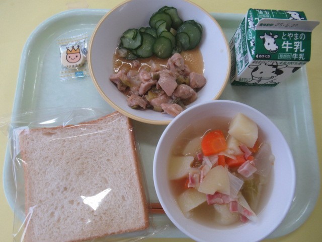 22日(木)今日の献立 公開日 2025/05/22 更新日 2025/05/22 給食室 ・食パン ・牛乳 ・あっさりチキン・きゅうりもみ ・野菜のスープ ・ポケットチーズ※11時45分、検食終了。 毎週木曜日は、「パン食」の日です。今日も美味しく出来上がっています。