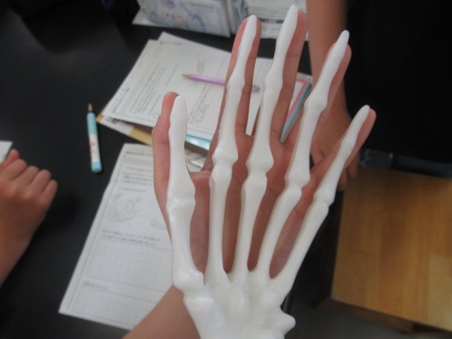 骨や筋肉について学んでいます。腕を曲げたり伸ばしたりすると、体を動かすと筋肉は伸びたり縮んだり・・・