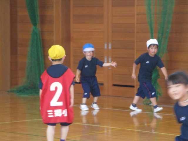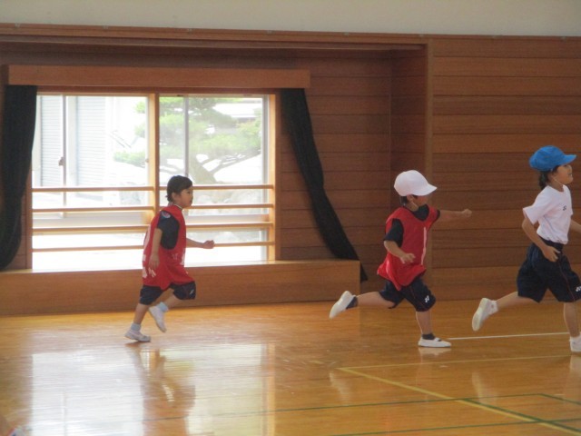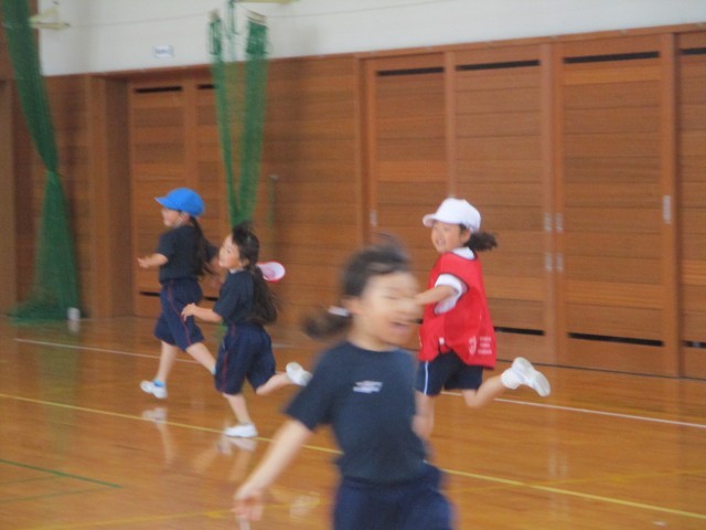 いろいろなおにごっこをして楽しみました。広い体育館の全面を使い、逃げ回ったり追いかけたりしました。