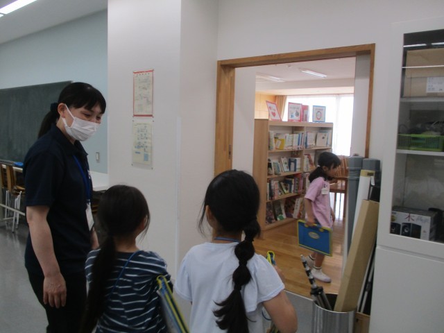 前回の学校探検を振り返り、友達の話を聞いて「もっといろんなところを見てきたい!」と意気込んだ子供たちは、学校探検へ行きました。今回は、近くにおられる先生に話を聞くなど、前回よりもパワーアップした探検ができました。