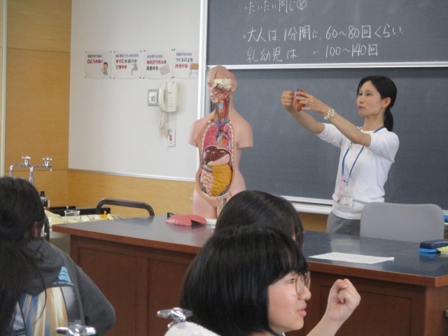 理科の学習では、脈拍や心拍について学習をしています。自分の心音を聞いています。