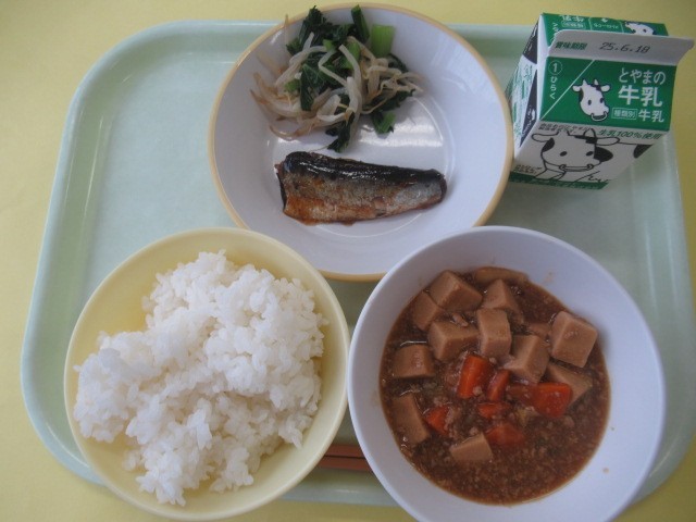 11日(水)今日の献立 公開日 2025/06/11 更新日 2025/06/11 給食室 ・ごはん ・牛乳 ・いわしの土佐煮・小松菜ひたし ・高野豆腐のごまみそマーボー※11時45分、検食終了。 今日のメニューは、「かみかみ献立」です。今月は「かみかみ月間」なの? 3回も「かみかみ献立」が登場します。 一口ごとに20~30回かむ習慣を身に付けたいですね。