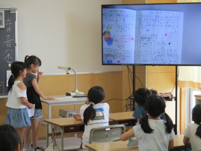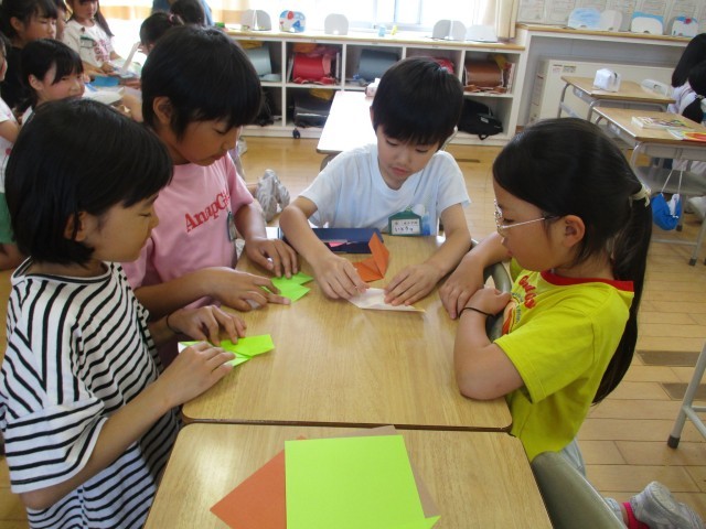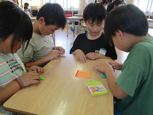 3年生は、それぞれが学級のみんなを楽しませようと係活動に取り組んでいます。今日は、折り紙係、くじ引き係、自作の本係が担当しました。折り紙係さんは、自分の得意な折り紙の折り方を教えてくれました。くじ引き係さんは、くじを引いてもらって、折り紙で作った手作りの景品をプレゼントしてくれました。自作の本係さんは、自分の作った物語を紹介してくれました。どの係もみんなを楽しませようと準備をがんばっていたので、みんなが笑顔になって素敵な時間を過ごすことができました。