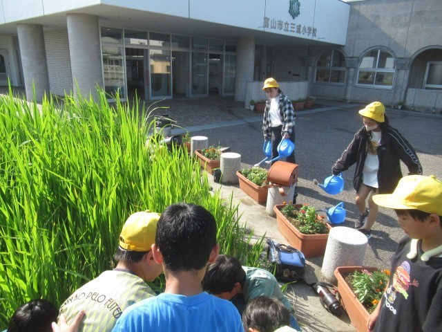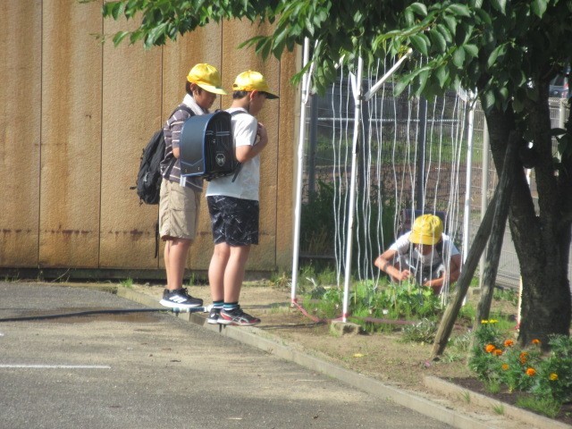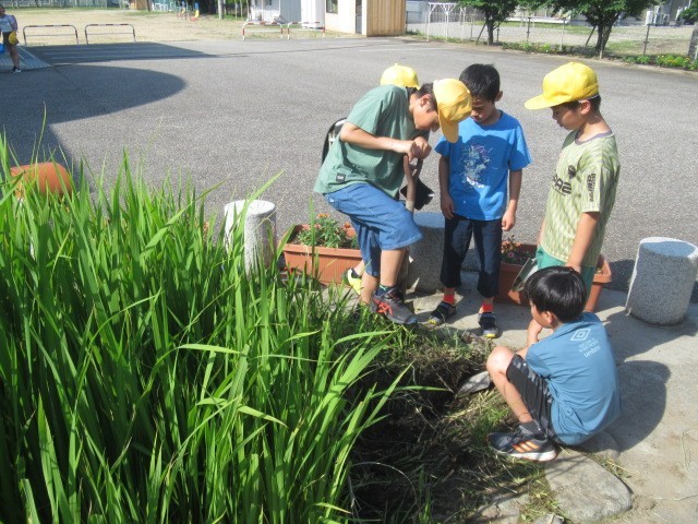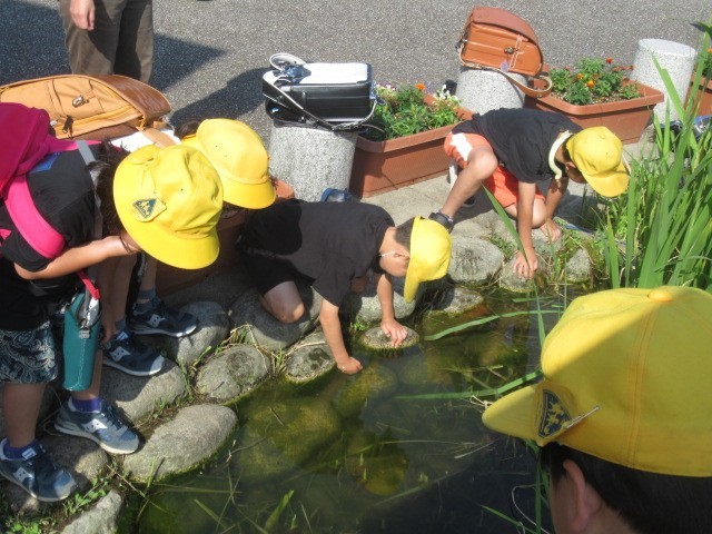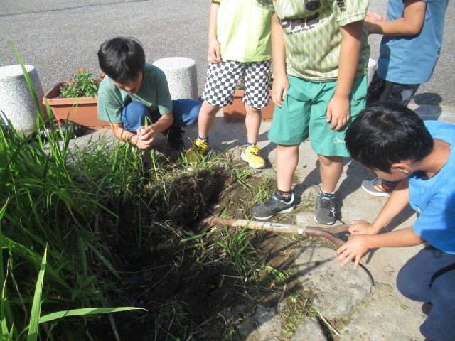 土がたまったビオトープ(西側)を広げようと、ボランティアで活動する子供たちもいます。