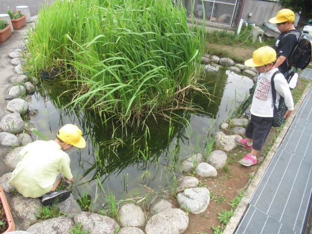 ビオトープ(池)が気になる子供たち・・・興味津々!